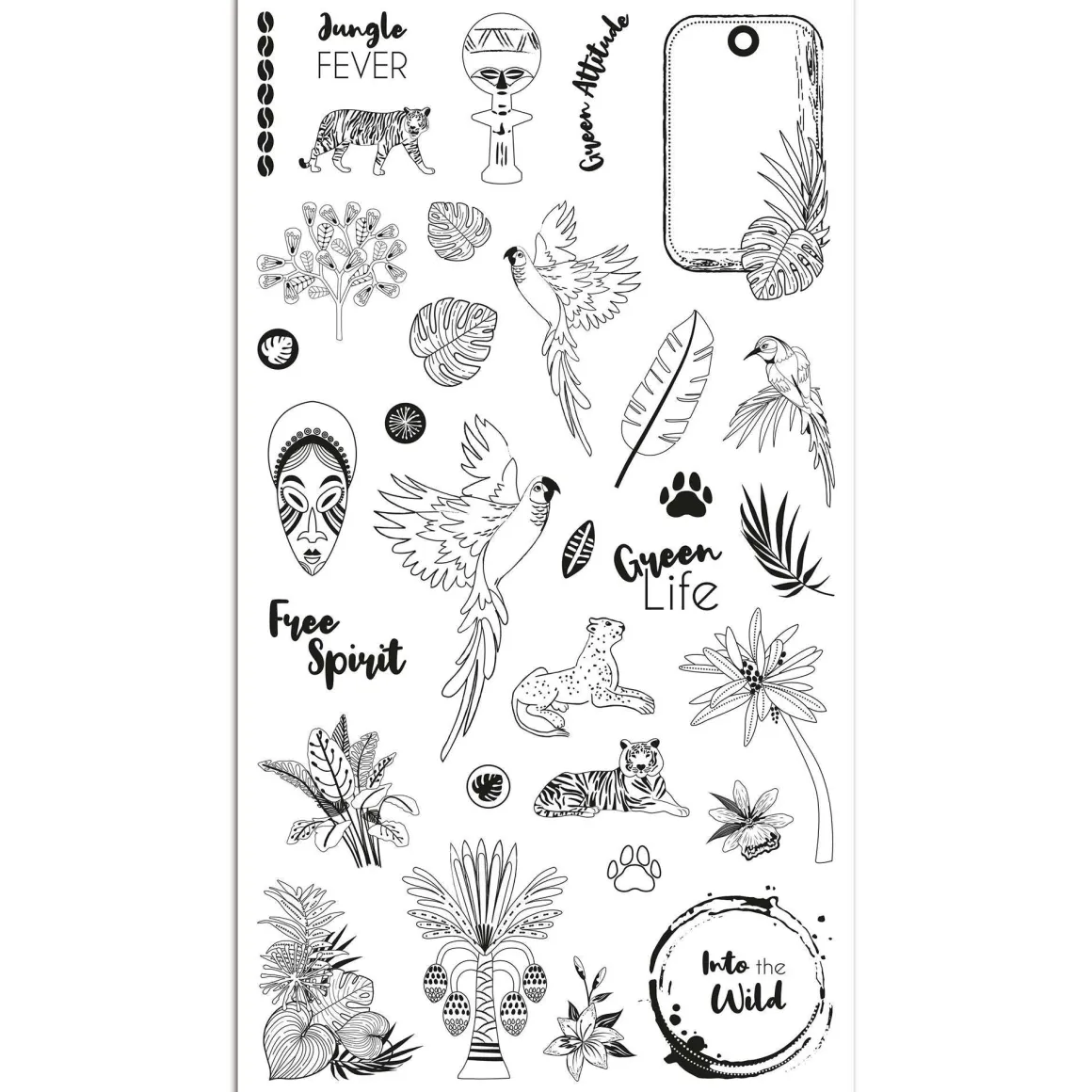 Découvrez nos tampons Crystal sur le thème du Safari ! Vous allez pouvoir décorer vos supports papiers préférés de magnifiques dessins de perroquets, arbres exotiques, tigres ainsi que des mots et phrases tels que « Jungle Fever », « Green Life » ou encore « Free Spirit ». Cette planche vous accompagnera dans tous vos projets créatifs. Retrouvez les différents thèmes de tampons Crystal et nos blocs acryliques dans la catégorie DIY.