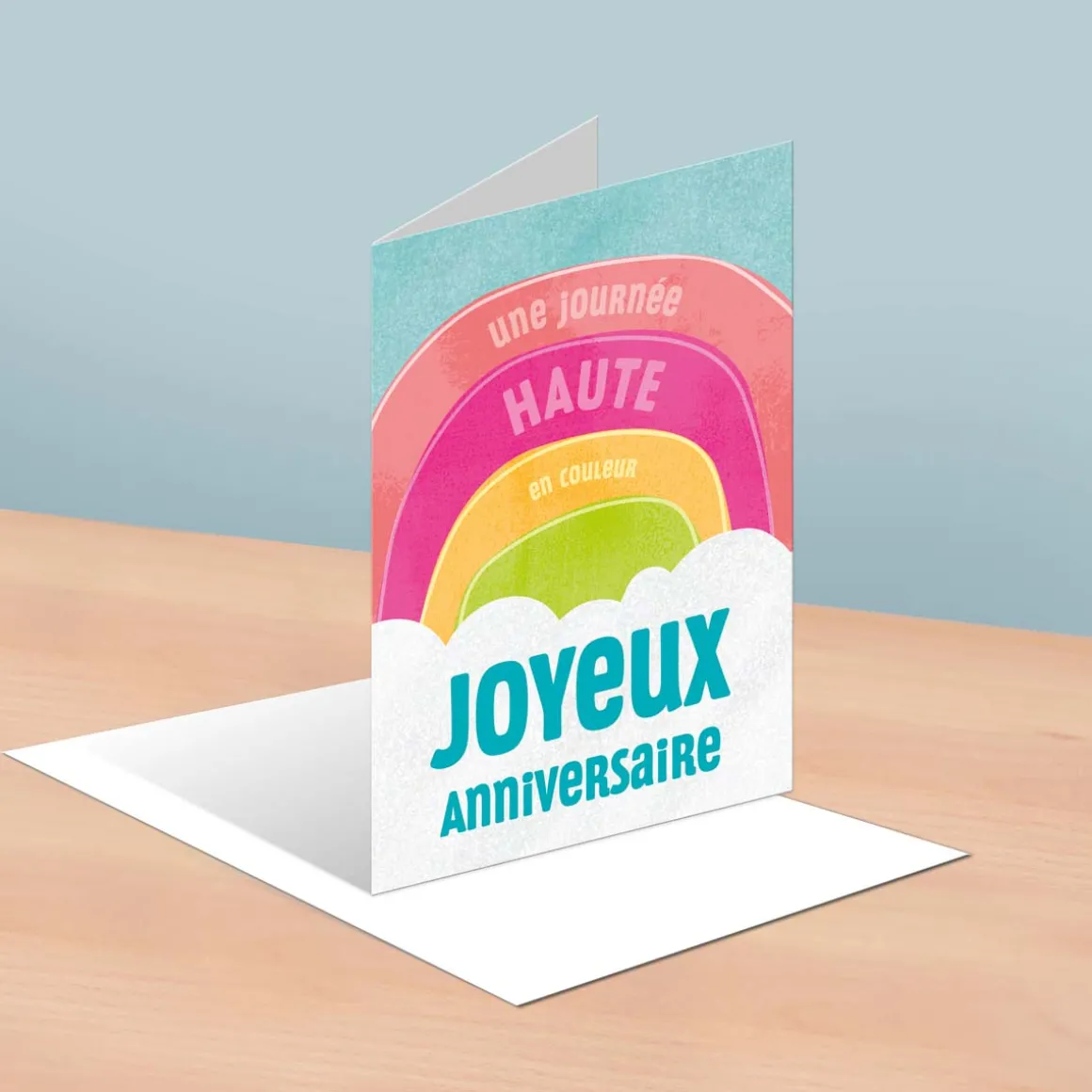 On a tous une âme d’enfant qui sommeille en nous. Succombez pour cette tendre carte arc-en-ciel pour le plus grand plaisir de la personne qui la recevra. Ces tons pastel et son petit nuage mettent en valeur le « Joyeux anniversaire ». Faites part de vos pensées en laissant des mots doux à l’intérieur de la carte.