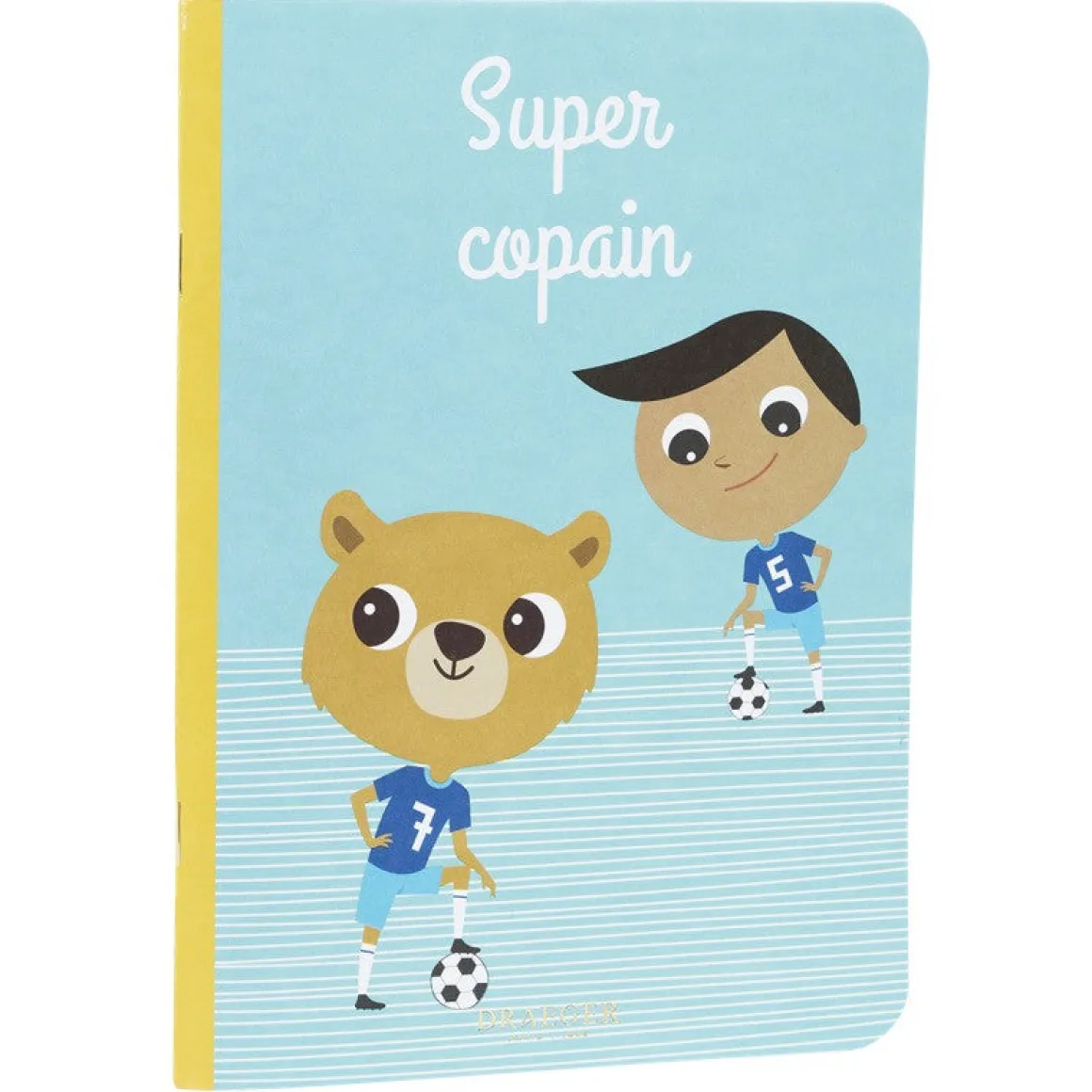 Super Copain, c’est un cahier pour enfant dans lequel les petits garçons ou les petites filles peuvent écrire leurs pensées, dès le plus jeune âge. Tel un journal intime, ils auront la possibilité de mettre par écrit leurs sentiments, leurs histoires de la vie de tous les jours mais également faire participer leurs copains en leur faisant écrire un petit mot. Le cahier pour enfant Super Copain est illustré sur le thème du football.