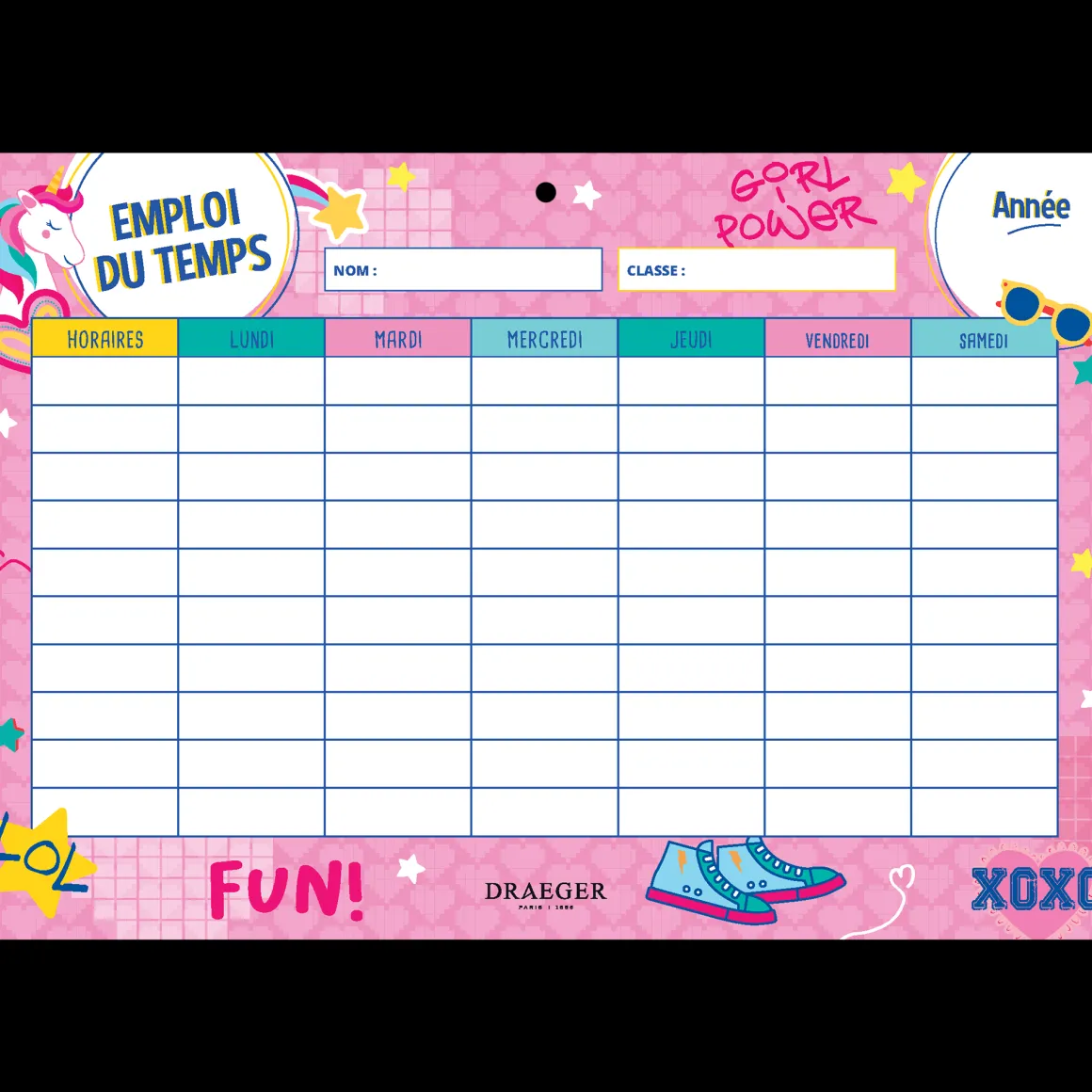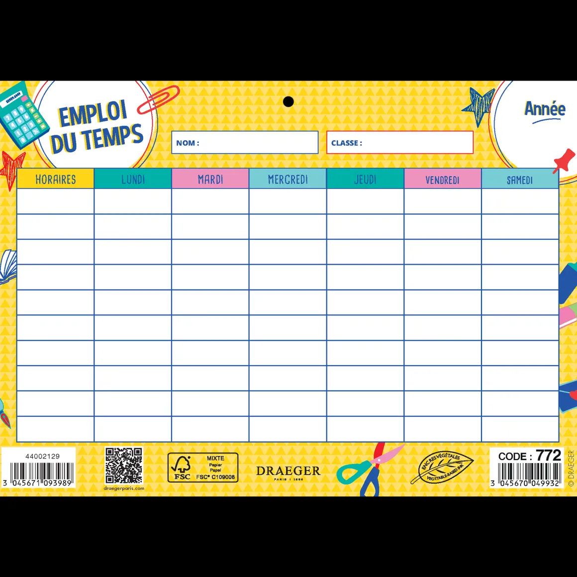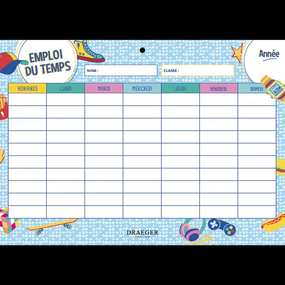 Cet emploi du temps scolaire 2024-2025 disponible dans 2 thèmes est un outil indispensable pour organiser les journées de classe. Imprimé sur du papier carton, il est facile à lire et résistant. Chaque journée de la semaine est représentée par une colonne, avec des cases pour chaque heure de cours. Les enfants seront ravis de l’utiliser pour noter leurs devoirs, leurs activités extra-scolaires et même leurs moments de détente. Avec cet emploi du temps, les élèves pourront mieux gérer leur temps et réussir leur année scolaire avec brio.