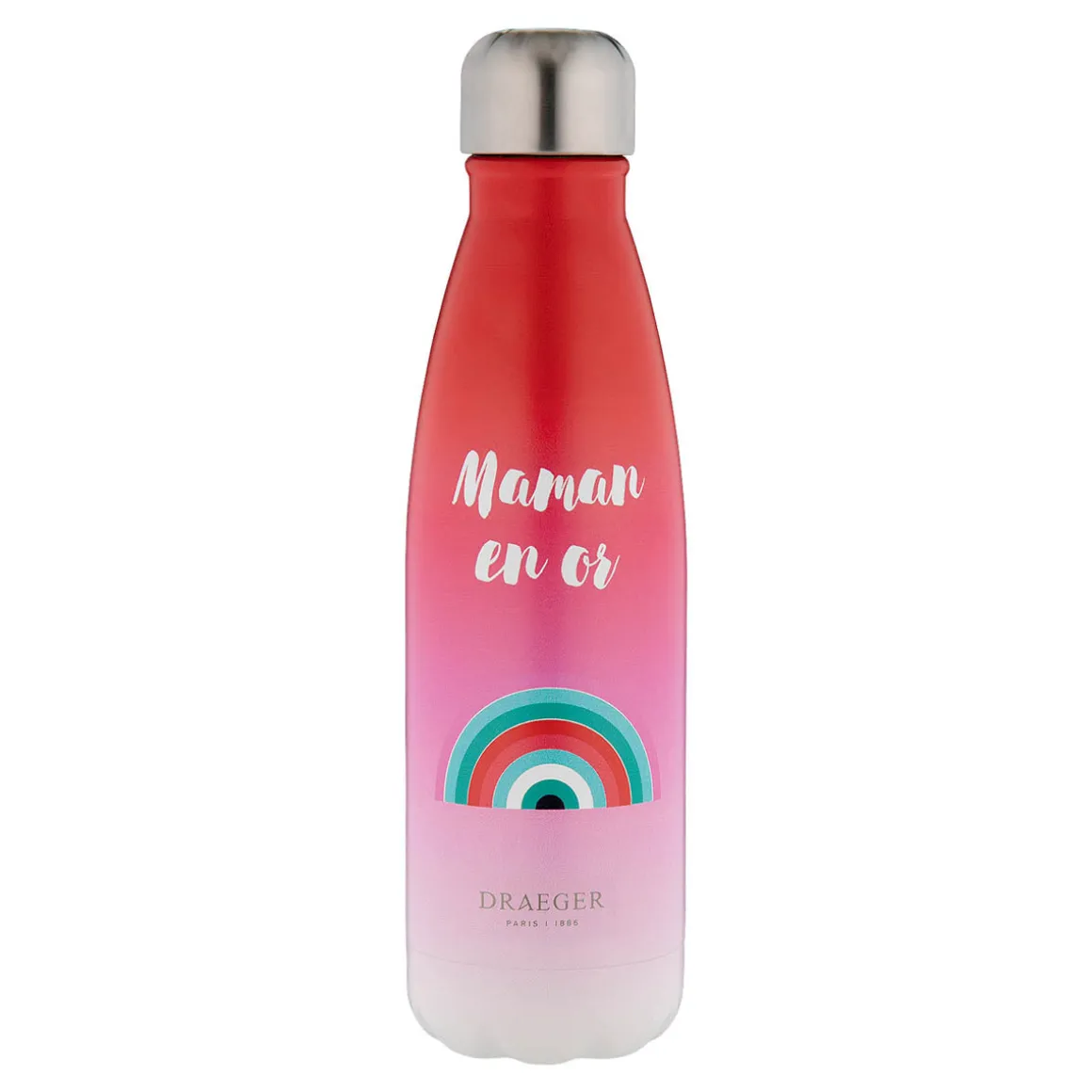 Découvrez notre jolie gourde rose dégradée en inox ! La gourde est devenue un accessoire incontournable depuis quelques années. À la fois écologique et tendance, elle remplace les bouteilles en plastique impersonnelles et polluantes. Notre gourde en acier inoxydable conservera la température de vos boissons (chaudes ou froides) ! Avec son message « Maman en or », elle fera un joli cadeau à offrir à votre maman adorée.
