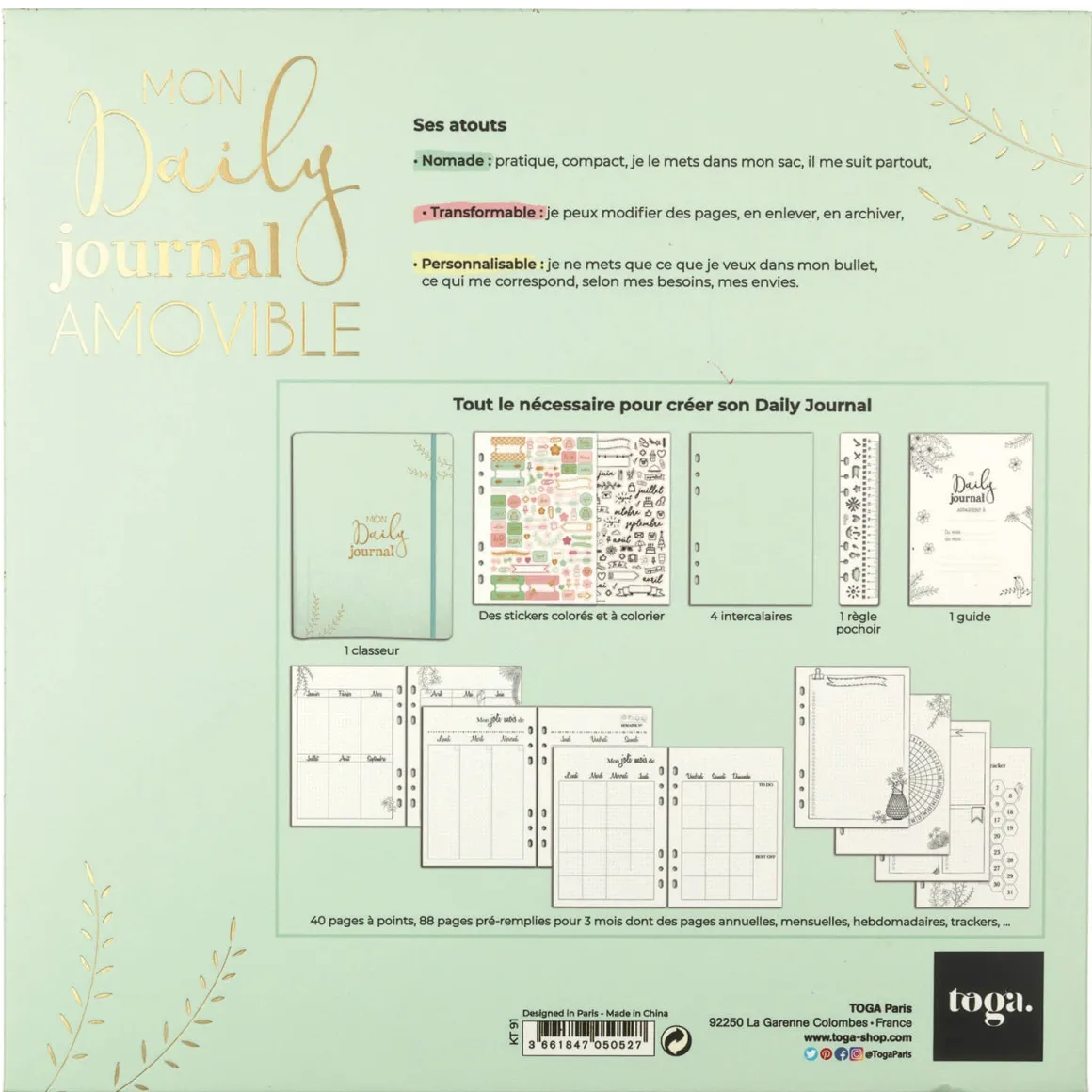- 1 classeur avec 40 pages à points et 88 pages préremplies (pages annuelles, mensuelles, hebdomadaires et trackers)