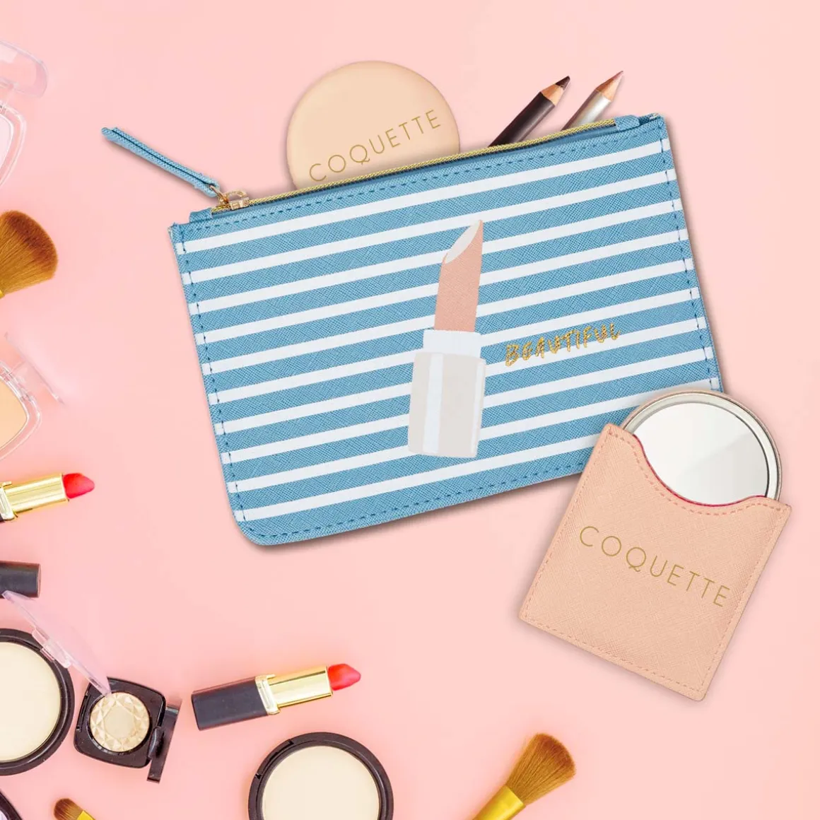 Ce lot contient une pochette avec un miroir où est inscrit ‘Coquette’ ! C’est une idée de cadeau originale, parfait pour toutes les occasions ! Offrez-le à une femme qui compte à vos yeux, elle sera ravie c’est certain ! Ce kit l’accompagnera dans tous ses déplacements pour qu’elle reste toujours belle et fraîche !