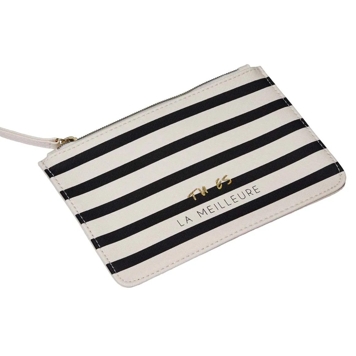 Faire un cadeau à l’un de ses proches est une belle attention. Mais offrir un cadeau avec une belle citation positive inscrite dessus, c’est encore mieux ! La pochette Tu es la meilleure apportera de la joie et de la positivité chaque jour à celle qui aura le plaisir de recevoir ce présent. La pochette rayée écru et noir s’intègre facilement avec tous les styles. Fermeture zippée.