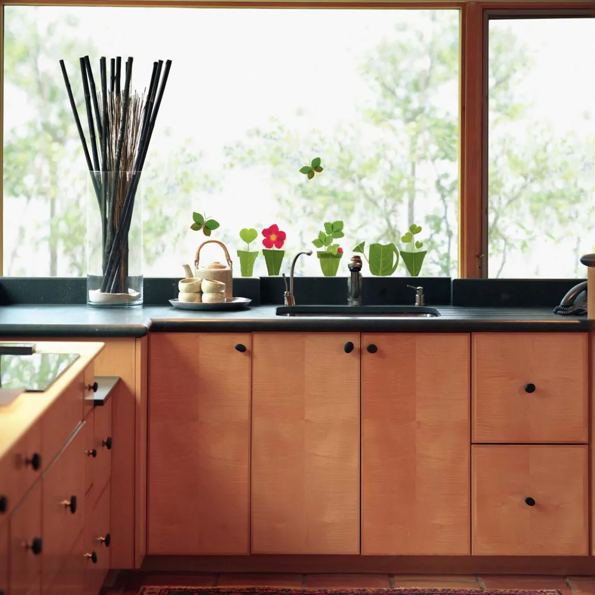 Des vitres 100% écolo, vêtus de verts et de quelques touches de rouge! Papillons, pots de fleurs et arrosoir, tout est représenté avec des feuilles dans ce lot de stickers pour fenêtres. Une évidence pour verdir votre intérieur ! Grâce à ces stickers double-face, la vue est aussi belle de l’intérieur que de l’extérieur. Ces pots en trompe l’œil sont une idée déco originale à partager dans toute la maison.