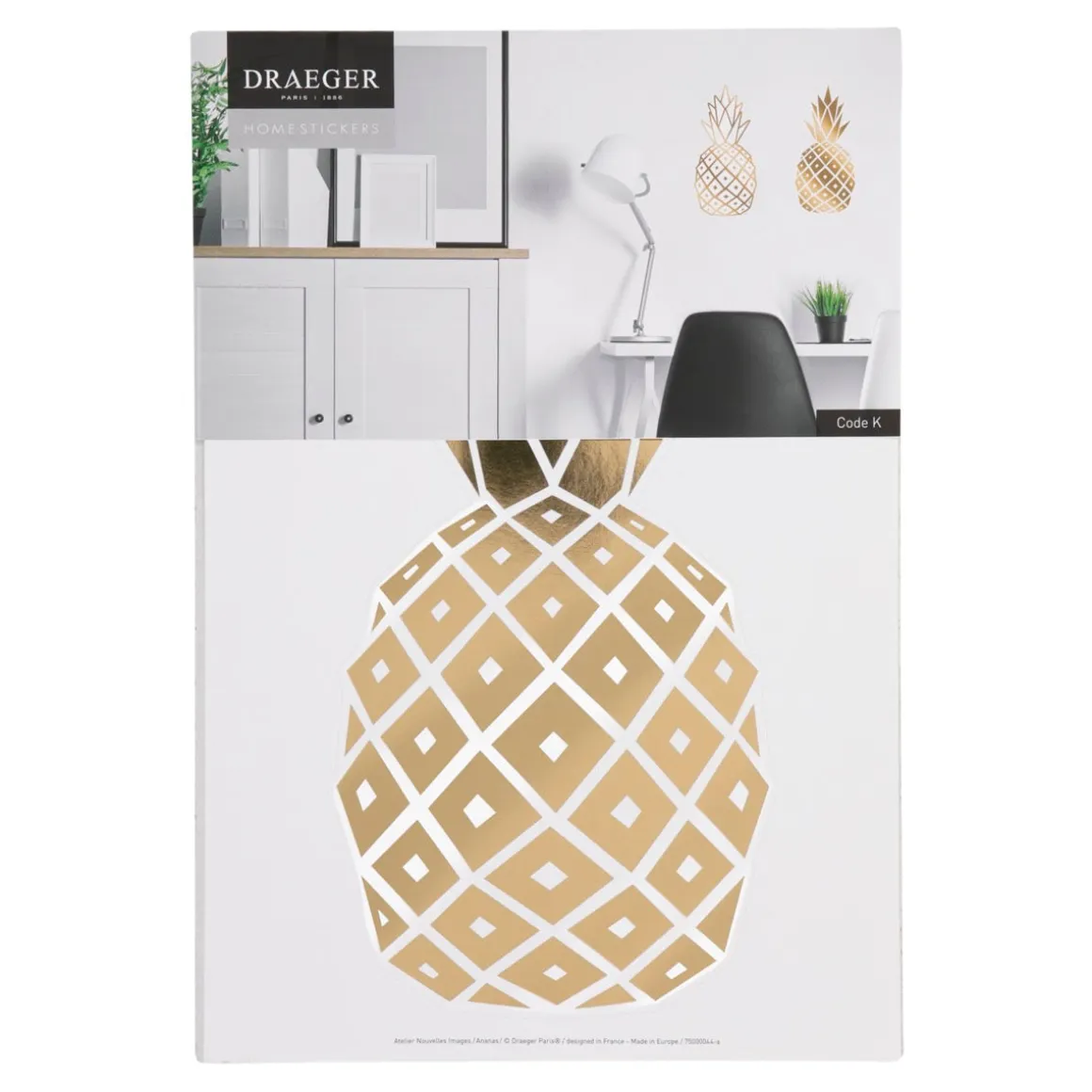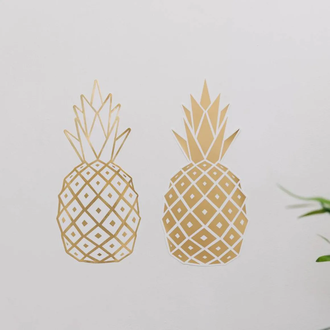 Bienvenue! Roi des fruits par excellence, symbole d’hospitalité, l’Ananas fait ressortir l’exotisme et la générosité des intérieurs qui l’accueillent. Ce lot de deux stickers muraux Ananas doré rehausse les murs qu’il habille grâce à sa couronne de feuilles et ses lignes géométriques parfaites.