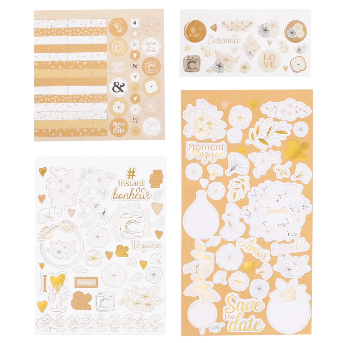 Vous êtes à la recherche de stickers et formes découpées pour vous aider à décorer vos supports papiers ? Vous êtes au bon endroit ! Vos journaux et albums photos prendront une toute autre allure avec ces planches de stickers dorées ! Rien de tel pour laisser parler sa créativité sans pour autant avoir besoin de dessiner pendant des heures. Pas de doute, à la fin vous serez 100% satisfait(e) du rendu !