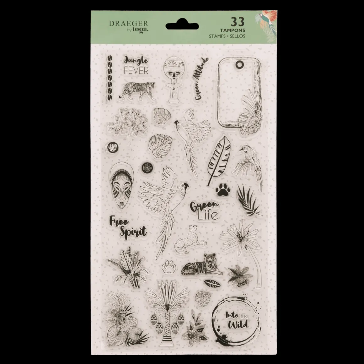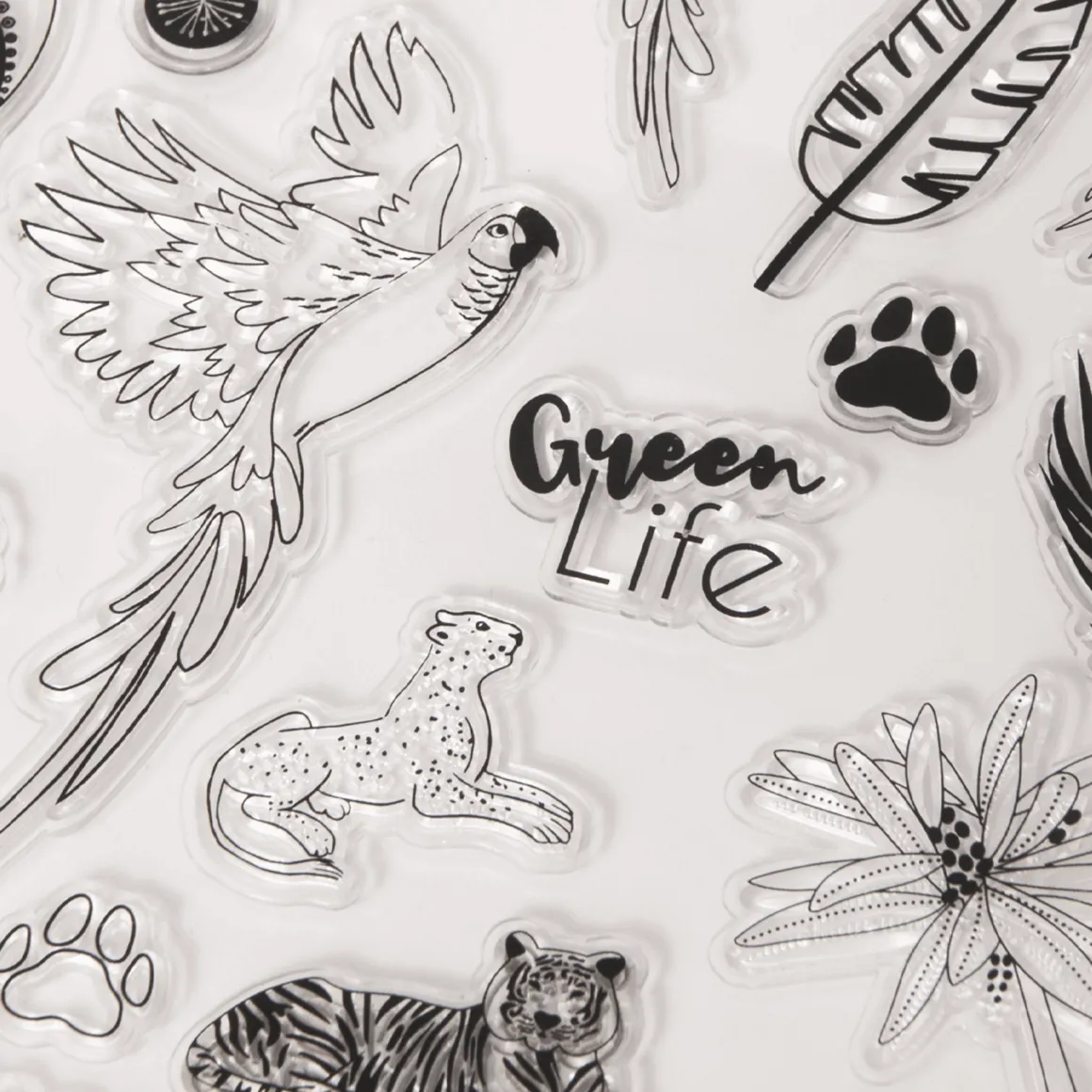 Découvrez nos tampons Crystal sur le thème du Safari ! Vous allez pouvoir décorer vos supports papiers préférés de magnifiques dessins de perroquets, arbres exotiques, tigres ainsi que des mots et phrases tels que « Jungle Fever », « Green Life » ou encore « Free Spirit ». Cette planche vous accompagnera dans tous vos projets créatifs. Retrouvez les différents thèmes de tampons Crystal et nos blocs acryliques dans la catégorie DIY.