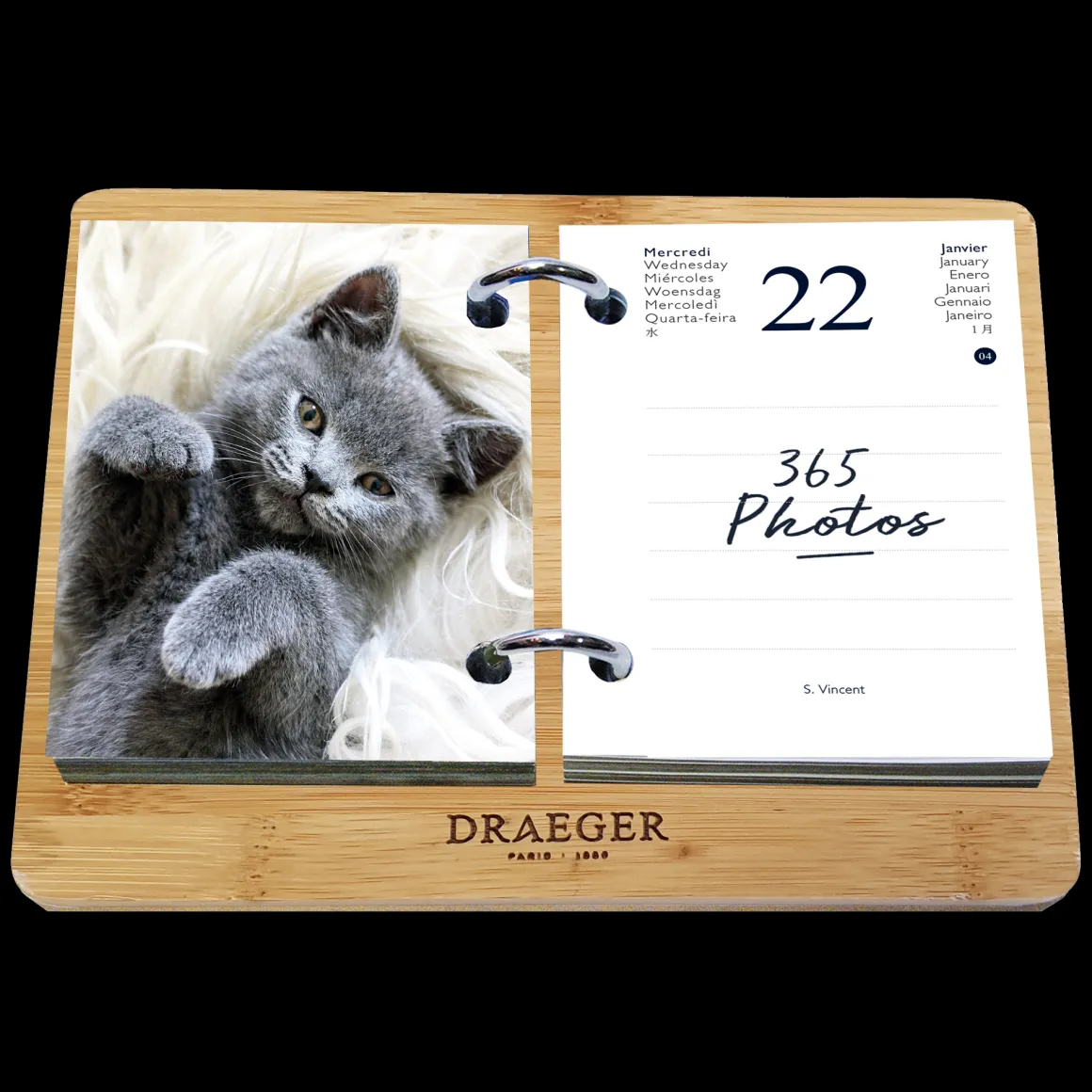- Le coffret contient la recharge de 365 feuillets et le socle en bambou.