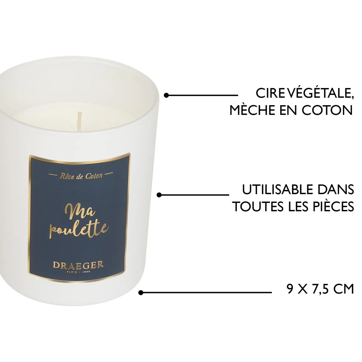 - Matières : verre, cire végétale, mèche en coton.