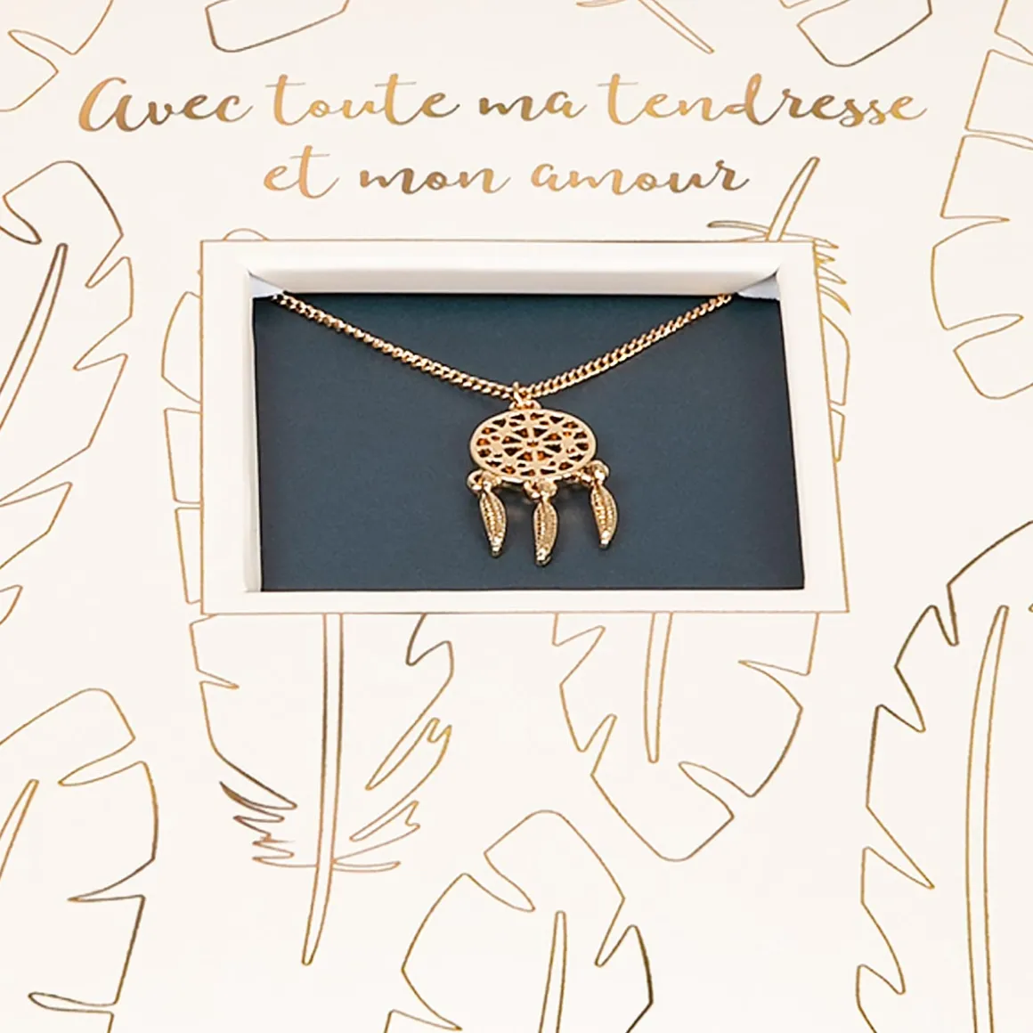 Capturez vos rêves avec cette carte bijou représentant un collier attrape-rêves, parfait pour offrir à un être cher. Fabriquée à partir de matériaux de haute qualité, cette carte bijou est à la fois élégante et durable, offrant une façon unique de partager vos sentiments. Le design délicat et intemporel de ce collier ajoutera une touche de mystère à n’importe quelle tenue, faisant de cette carte bijou un cadeau mémorable pour toutes les occasions.