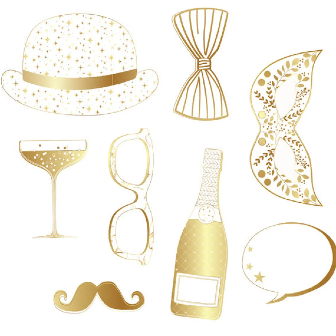 - Kit 8 accessoires photobooth pour animer les fêtes de fin d’années : – Nœud papillon, lunettes, bouteille de champagne, moustache, chapeau melon, verre de vin, masque, bulle BD. – Baton de bambous, stickers.