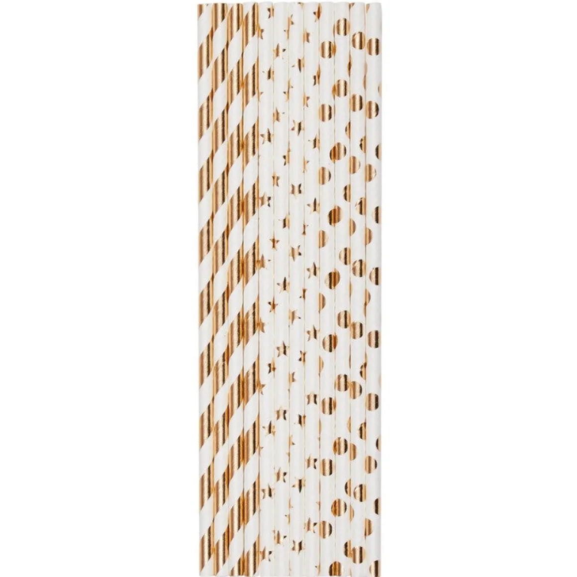 Assortiment de 24 pailles décoratives et alimentaires en carton blanc et or.