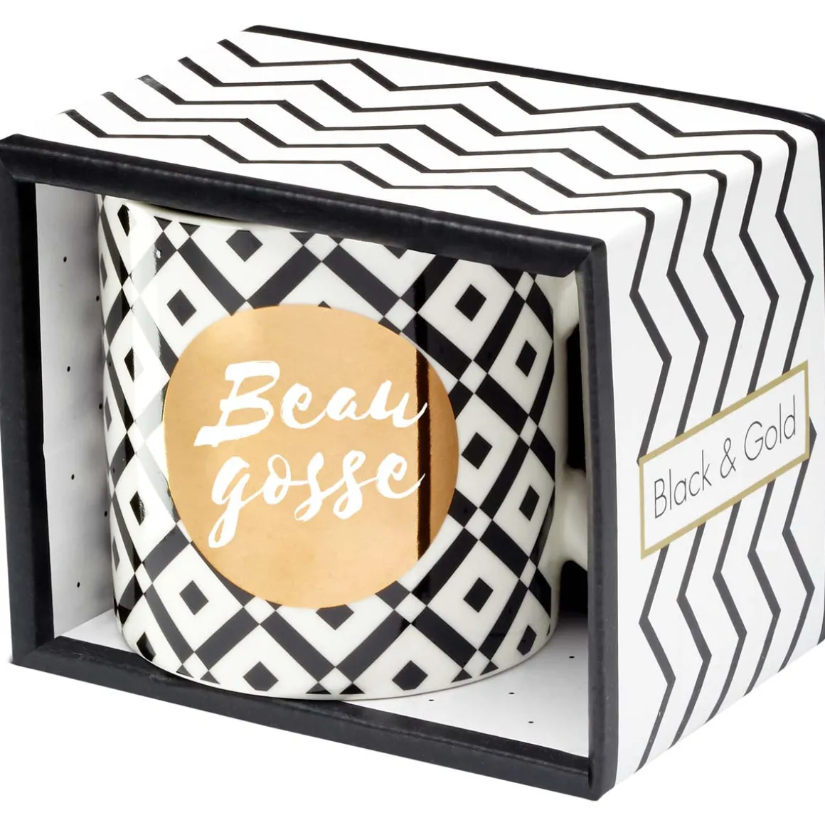 A consommer en toute modestie, ce mug Black and Gold personnalisé ‘Beau Gosse’ en touchera plus d’un. Mais attention à ne pas avoir les chevilles qui enflent, cette tasse noire et dorée d’une contenance de 350 mL fera des jaloux lors des pauses café. Ce mug original est livré dans une boîte cadeau attractive et élégante pour la petite touche fancy.