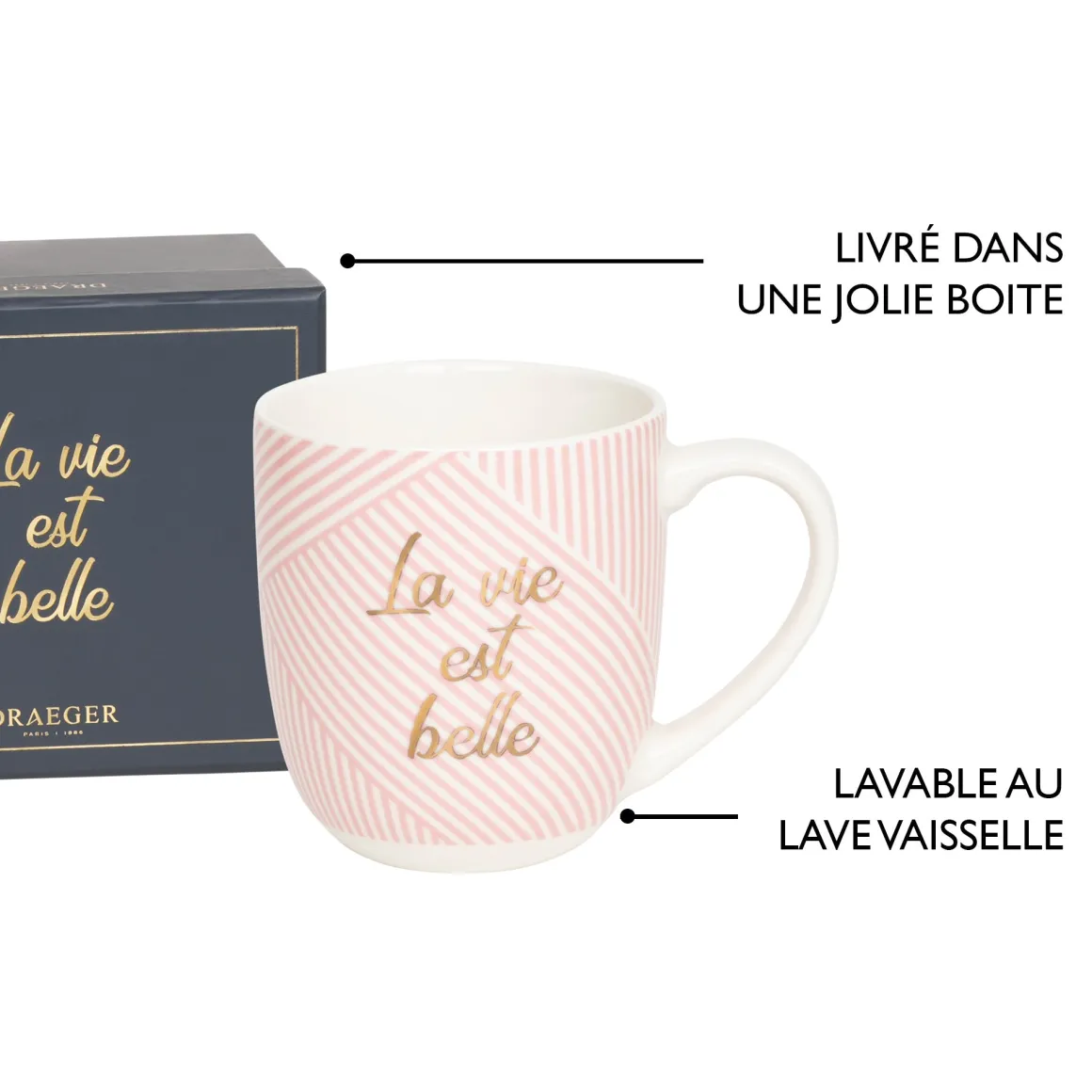 - Message à l’or à chaud inscrit sur le mug : La vie est belle