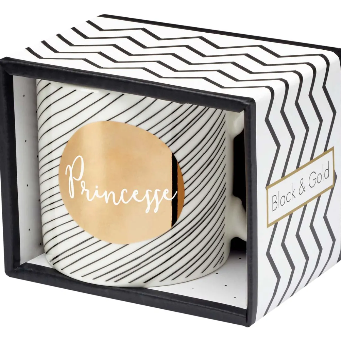 Comme une belle princesse prisonnière dans son château, la personne de votre cœur n’attend que d’être délivrée par une délicate attention témoignant de tout votre amour. Libérez-la en lui offrant ce joli mug Black and Gold personnalisé ‘Princesse’. Sa contenance de 350mL sera parfaite pour son thé, son café ou toute autre boisson qu’elle désirerait. Ce mug original est livré dans une boîte cadeau attractive et élégante pour la petite touche fancy.