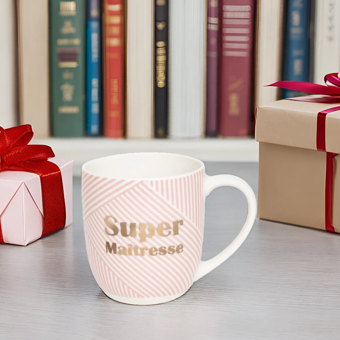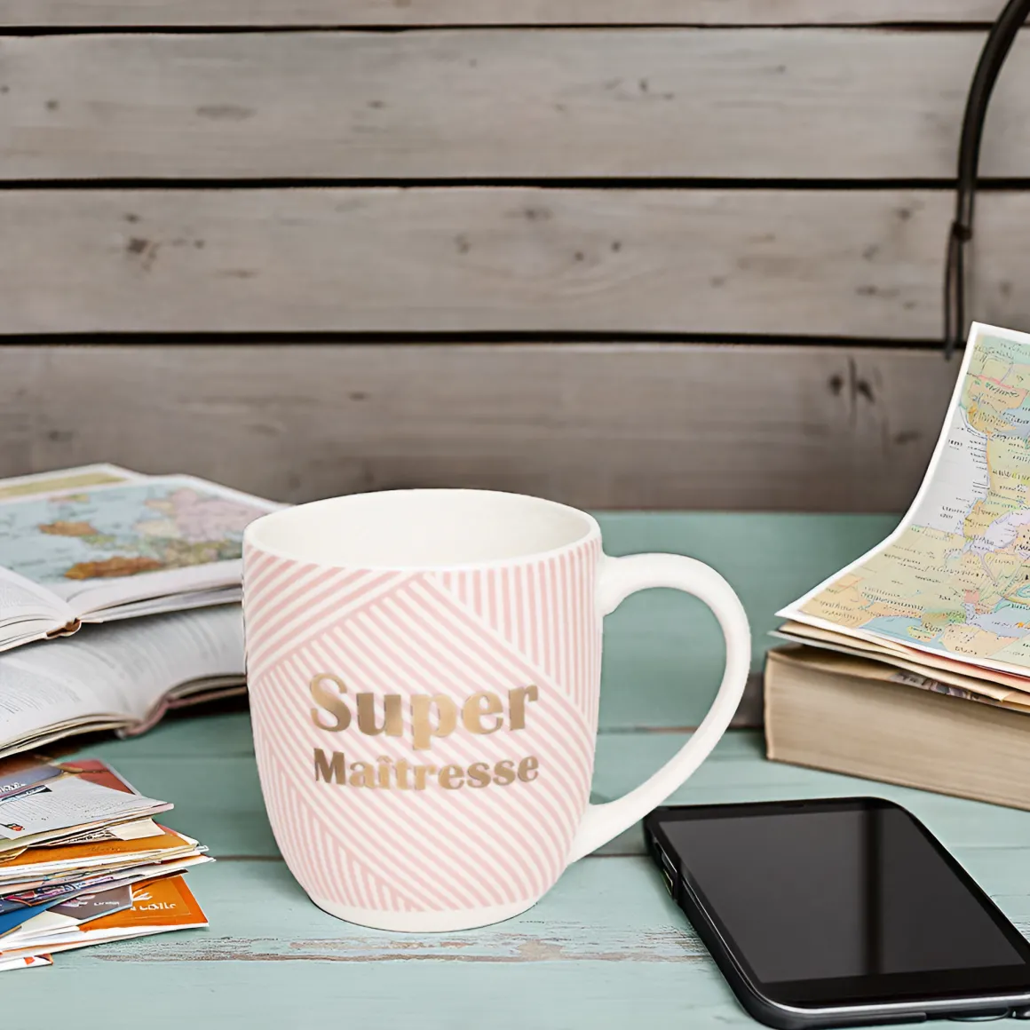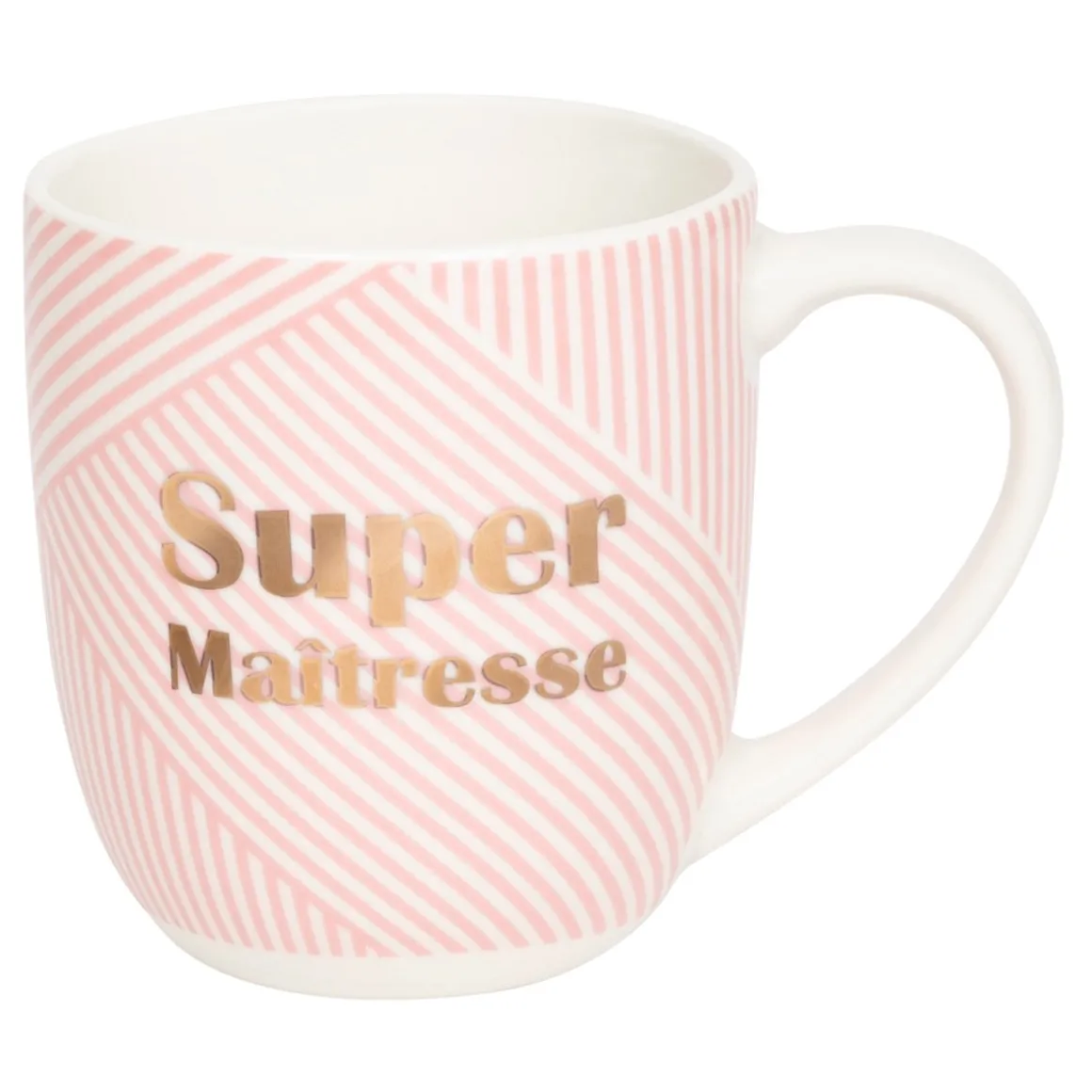 - Message à l’or à chaud inscrit sur le mug : Super maîtresse