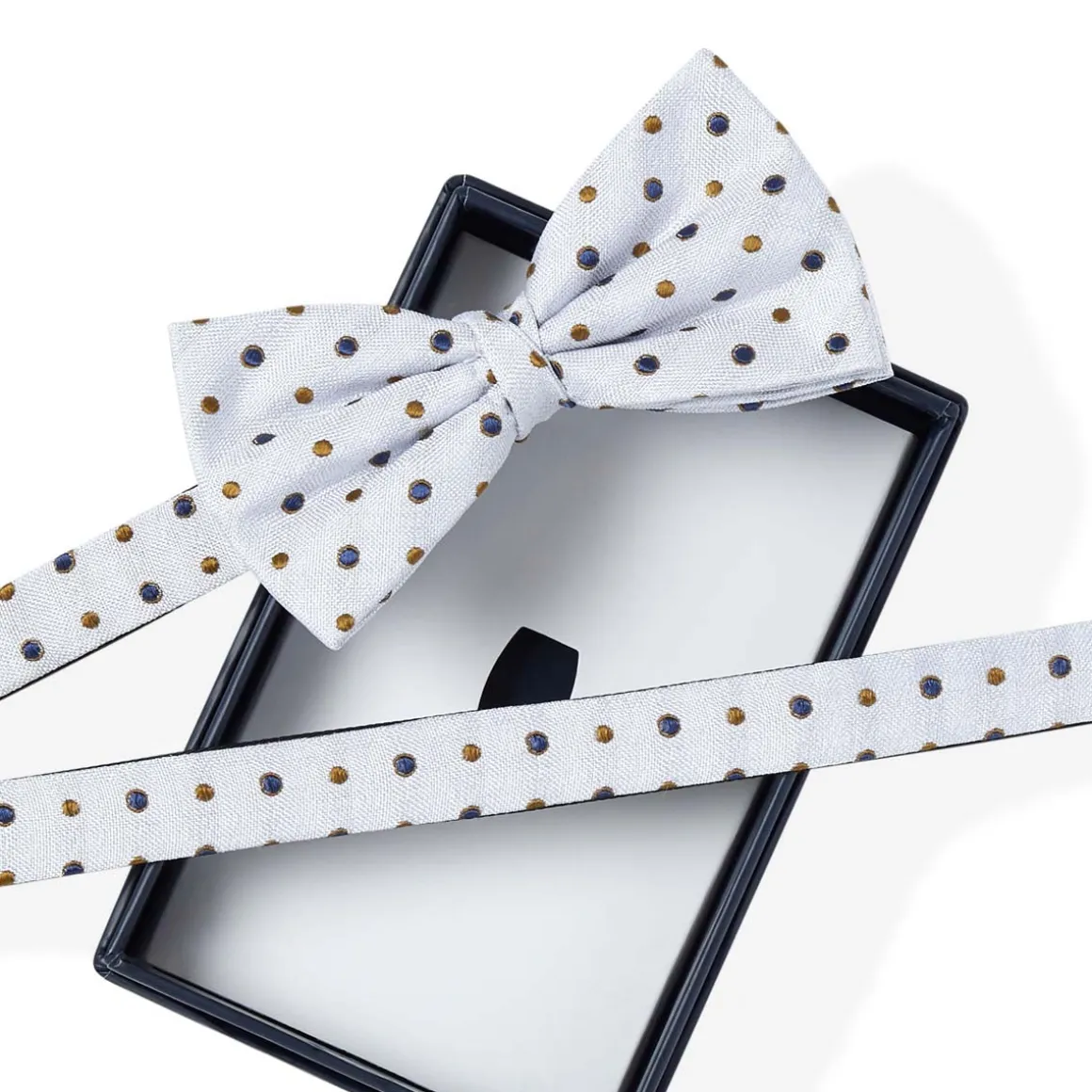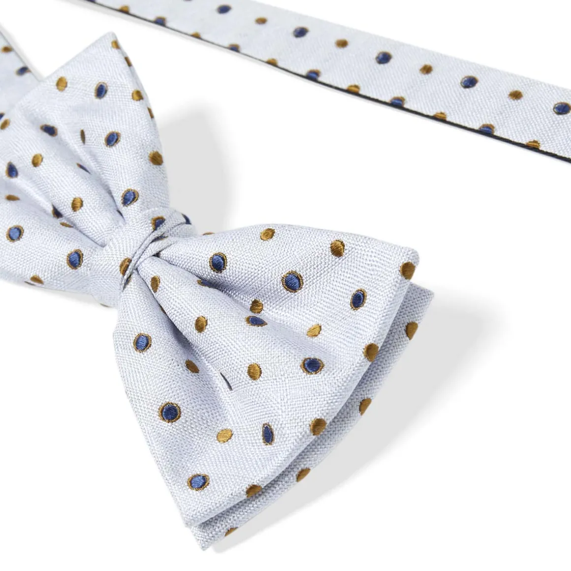 - Nœud papillon gris clair à pois bleu marine et camel.