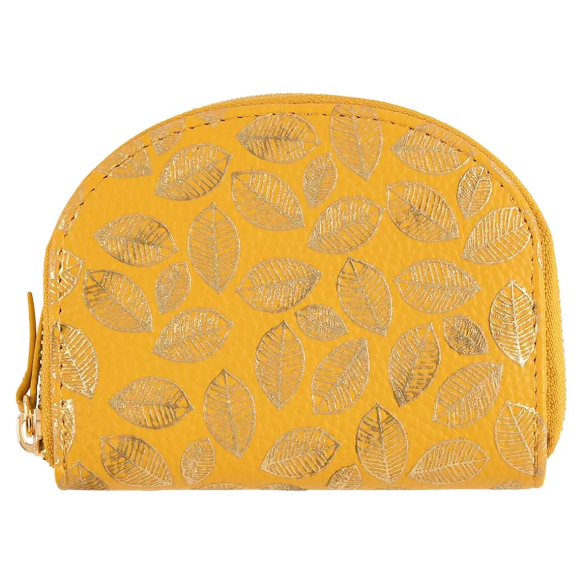 - Porte-monnaie jaune moutarde avec des feuilles dorées .