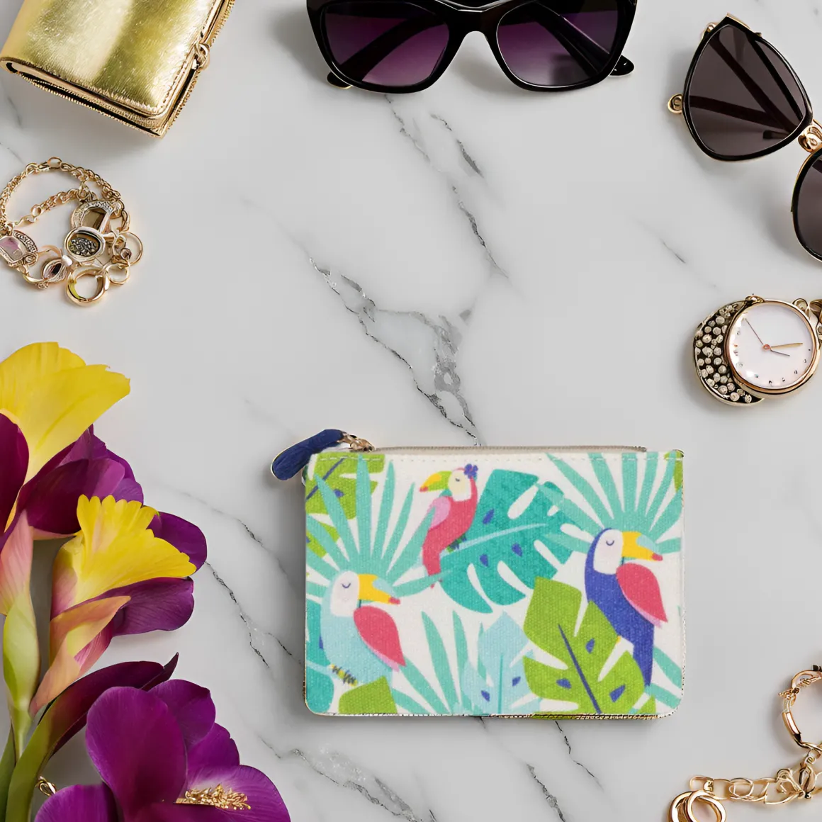 Vous aimez la jungle, les pays exotiques et le soleil ? Alors vous allez sans aucun doute craquer pour ce porte-monnaie en coton imprimé d’illustrations de toucans et de feuilles de palmiers ! Il se glissera dans votre sac-à-main et fera office de porte-monnaie ou de pochette de rangement, selon vos désirs. Idéal pour un petit cadeau d’anniversaire original et pas cher ! Si vous étiez à la recherche d’un cadeau d’anniversaire, vous êtes au bon endroit !