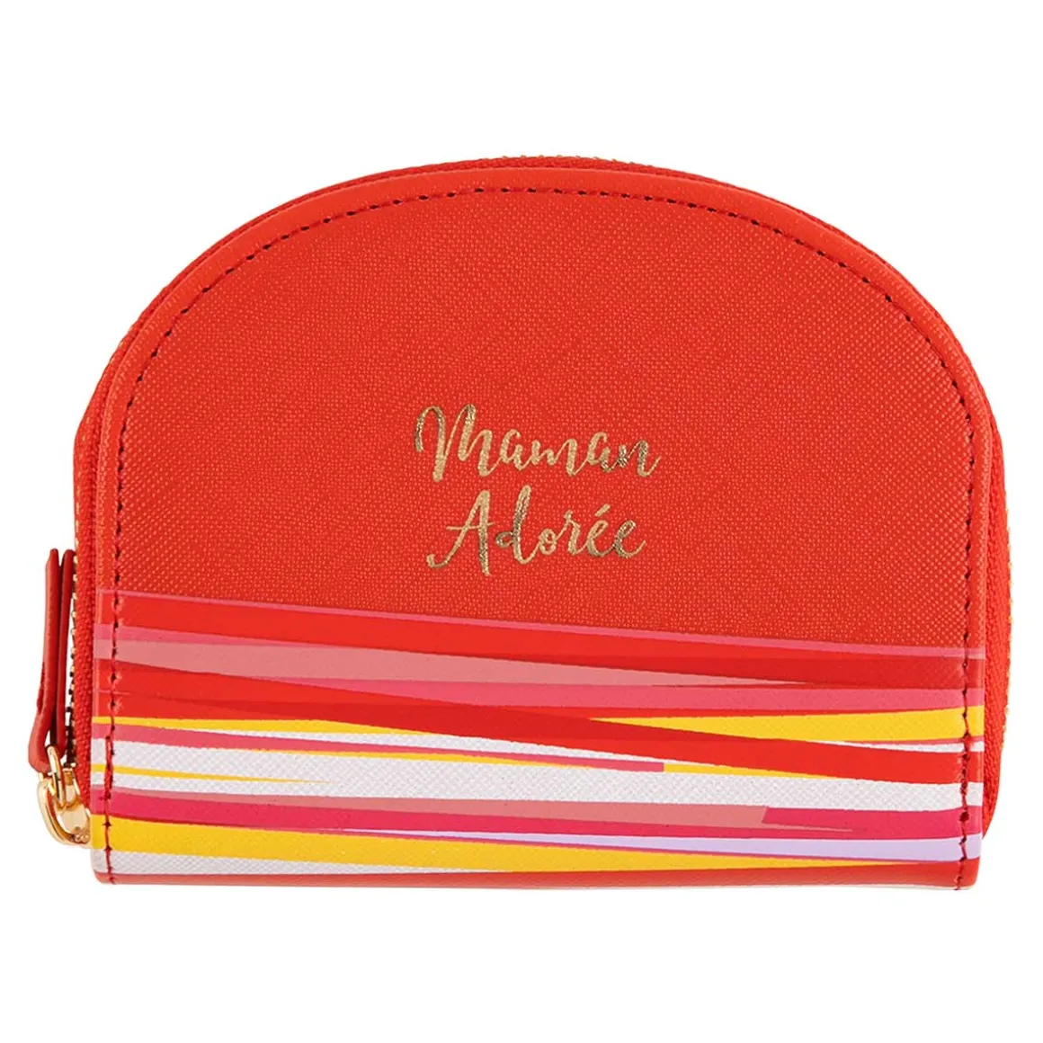 - Porte-monnaie rouge avec quelques lignes graphiques et le texte doré « Maman adorée ».