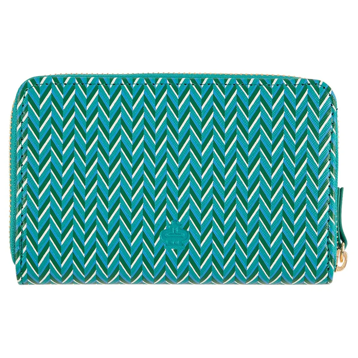 - Portefeuille à motifs graphiques verts, turquoise et blancs.