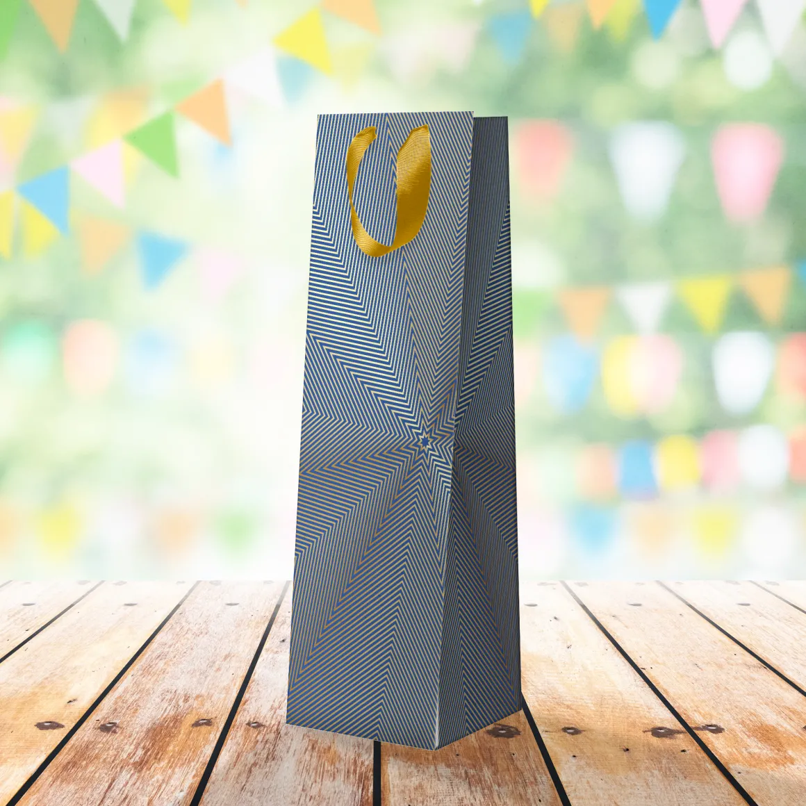 Le sac bouteille de vin bleu et or allie élégance et durabilité pour sublimer vos cadeaux. Conçu en papier certifié FSC, il respecte l’environnement tout en offrant une finition haut de gamme. Son impression à l’encre végétale et sa délicate technique d’or à chaud apportent une touche de raffinement qui séduira à coup sûr.