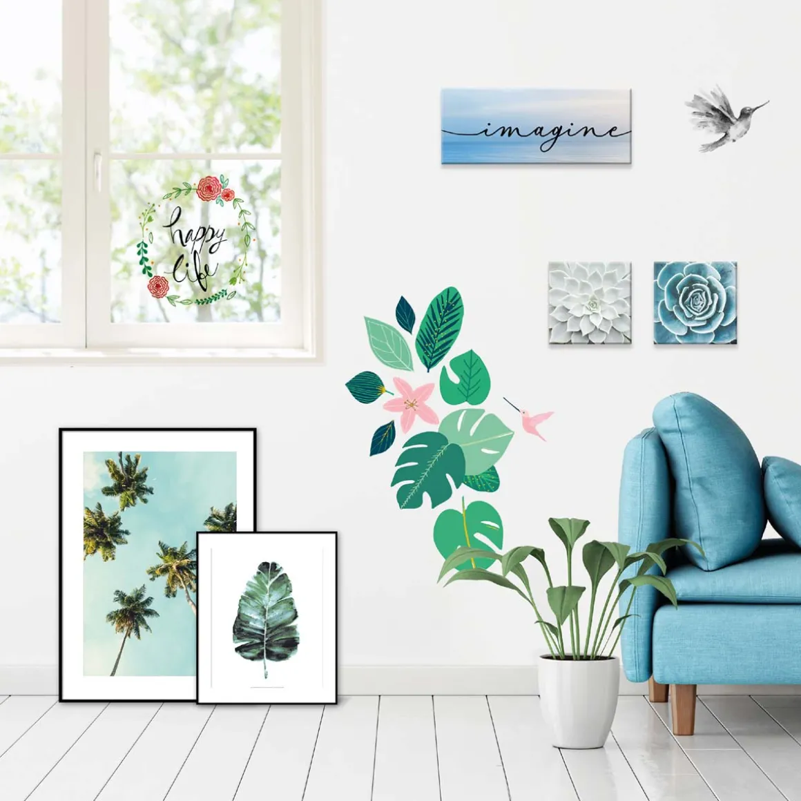 Une envie de s’évader, de chaleur et de vacances ? Avec ce Sticker jungle nature, vous apportez une touche tropicale à votre intérieur. Un camaïeu de vert formé par d’e=épaisses feuilles et une colibri rose et vert. Ce sticker ira parfaitement avec les stickers pour fenêtre de la même collection et trouvera place dans chacune de vos pièces à vivre.