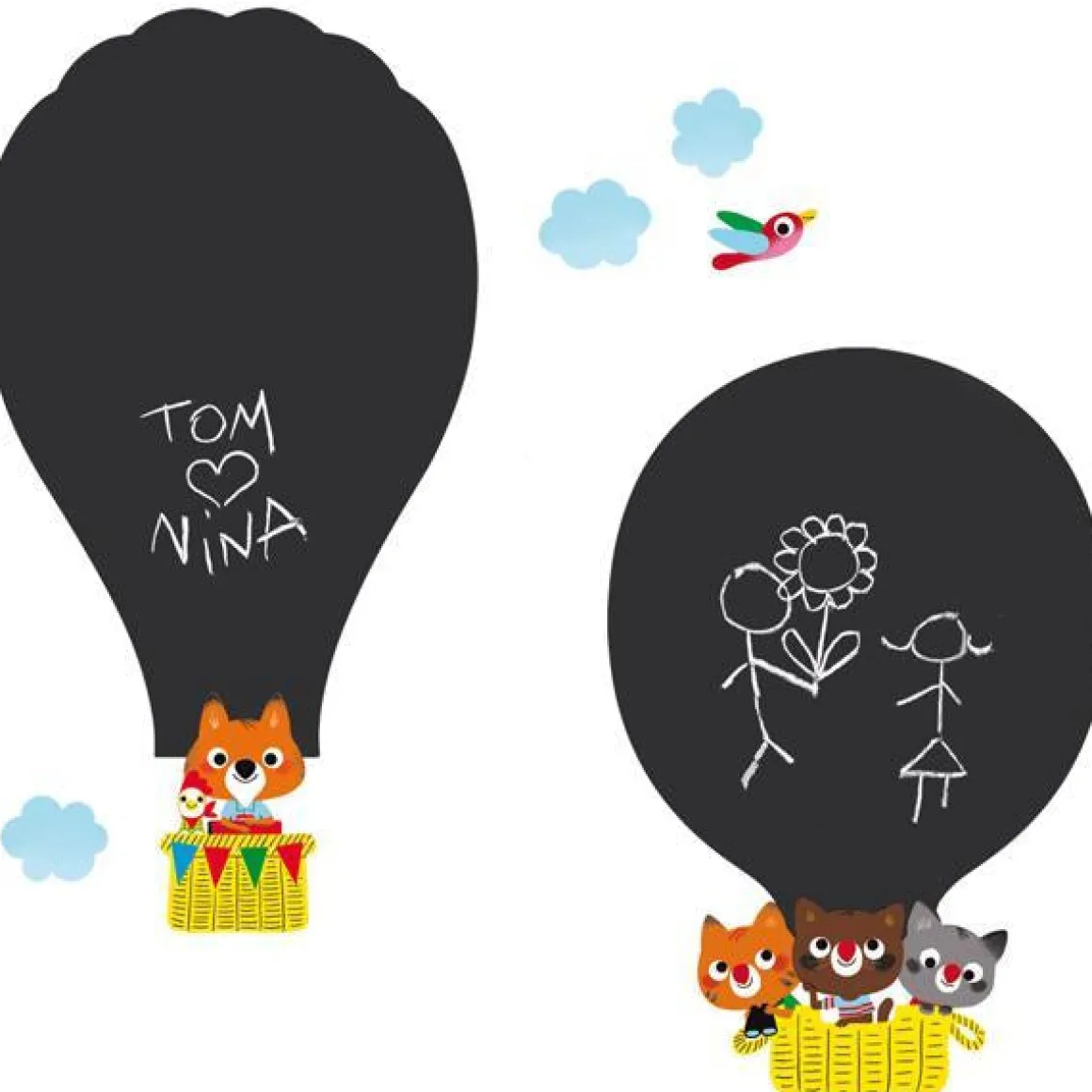 Ecrivez vite vos messages, les montgolfières vont s’envoler ! Avec ces ardoises ludiques et colorées, votre enfant a enfin le droit de laisser libre cours à son imagination sur les murs de sa chambre… En 5 minutes chrono, nos stickers se posent comme des décalcomanies sur de nombreux supports : murs, portes, meubles, qu’ils soient peints (satin ou laque), en métal, verre ou bois vernis.